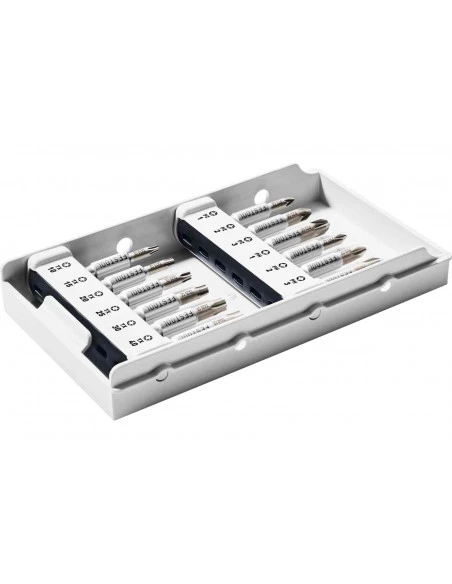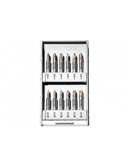 Composition 12 pièces : embout PH 1, embout PH 2, embout PH 3, embout PZ 1, embout PZ 2, embout PZ 3, embout TX 10, embout TX 15, embout TX 20, embout TX 25, embout TX 30, embout TX 40.